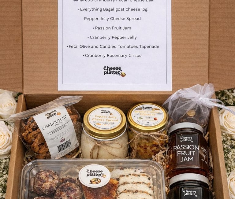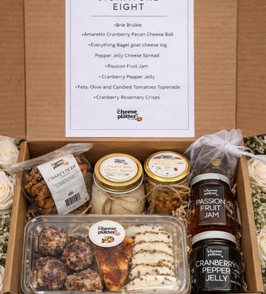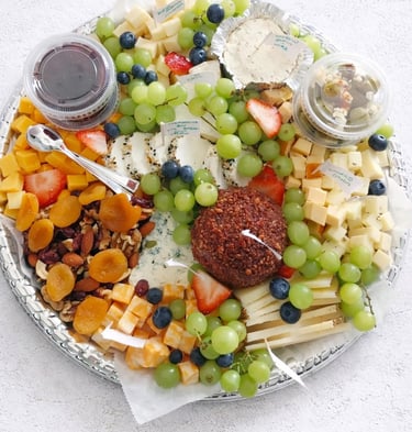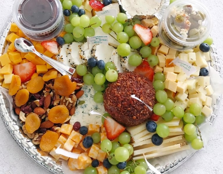 A curated selection of cheeses, cured meats, crackers, fruit, nuts, and gourmet pairings for every occasion.