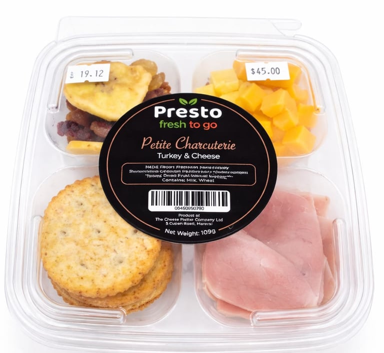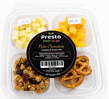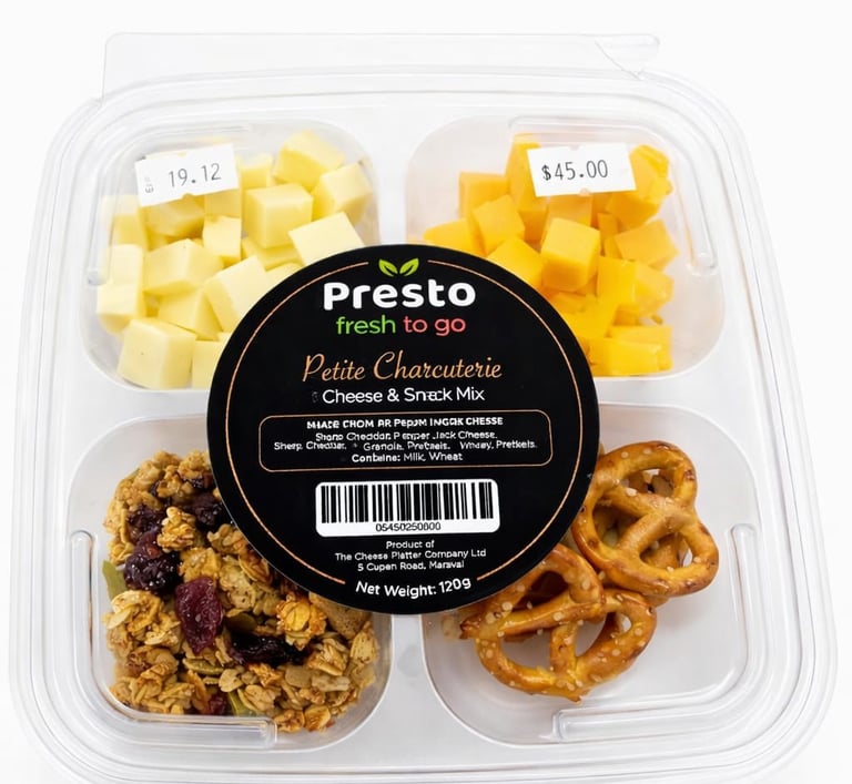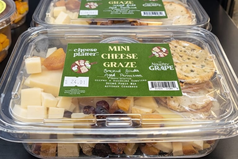 A convenient mini graze box featuring Three Premium Cheeses with Mediterranean Olive mix, Exotic Dried Fruit and Artisan crackers, perfect for a quick gourmet graze on the go..